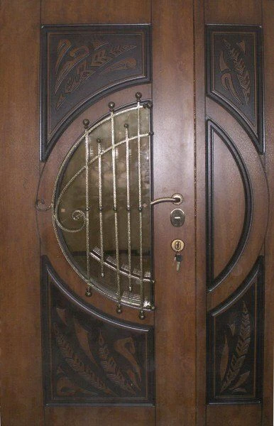Часто декорирование дверей ковкой используют вместе со стеклом, отделывают витражным узором, используют зеркальные вставки. Стекло в этом случае применяется антивандальное, с трудом поддающееся разрушению.