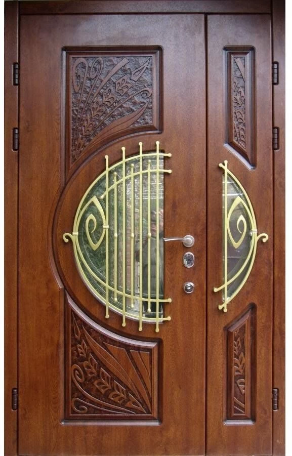 Часто декорирование дверей ковкой используют вместе со стеклом, отделывают витражным узором, используют зеркальные вставки. Стекло в этом случае применяется антивандальное, с трудом поддающееся разрушению.
