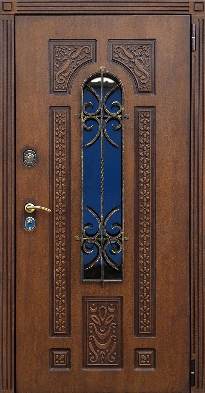 Красивый внешний вид немаловажное, но не самое главное преимущество металлических дверей с элементами ковки. Такие двери еще и очень надежны. Они изготавливаются из холоднокатаной стали толщиной 1,4-2 мм, отделываются массивом, корабельной фанерой, натуральным шпоном или МДФ-панелями, покрытыми виноритом. Установив на нее замки 3 или 4 класса взломостойкости, вы получите дверь, вскрыть которую с помощью грубой силы практически невозможно.