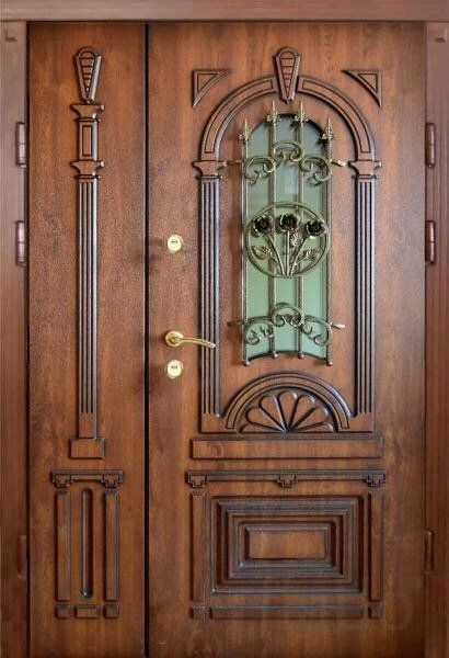 Парадные двери относятся к изделиям премиум-класса. Изготавливаются такие модели из металла толщиной не менее 2,0 мм, конструкция усиливается ребрами жесткости. Основной фактор, делающий парадные двери таковыми – их внешняя отделка. Для декора этих дверей, как правило, используют массив дуба, ясеня или сосны, натуральный шпон, корабельную фанеру, МДФ-панель, покрытую атмосфероустойчивой пленкой Винорит (VINORIT). Декоративные вставки из антивандального стекла, с применением элементов ковки, рисунок, который будет сочетаться с рисунком решеток на окнах, придаст коттеджу неповторимый внешний вид. Можно декорировать дверь витражным узором – и ваш дом заиграет яркими красками. По конструкции парадные двери могут быть как одностворчатыми, так и двустворчатым. При достаточной высоте проема, можно изготовить входную группу с декоративной вставкой сверху – прямоугольную или в виде арки. Терморазрыв в конструкции парадной двери сохранит тепло в доме, и предотвратит промерзание и кондедсирование двери в холодное время года, при этом не требуется обустройство в доме холодного тамбура.
